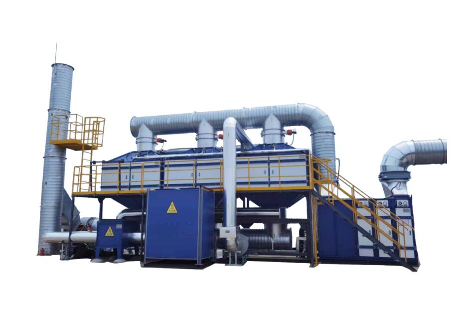 有機廢氣首先經過已經“蓄熱”的高溫陶瓷填充層進行預熱,蓄熱陶瓷由高熱傳導系數材料制成具有良好的熱交換特性。預熱后的有機廢氣通過燃燒室加熱到250℃左右,在催化劑的作用下迅速氧化并生成無害的CO2和H2O,同時釋放大量熱量。