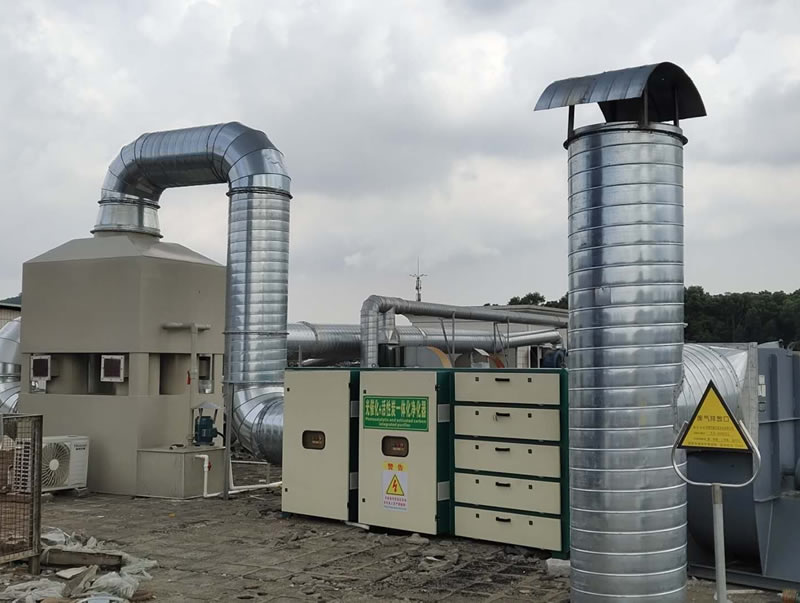 噴淋室內噴淋液經過霧化器的霧化形成層層水膜,首先廢氣由噴淋塔進氣口流入空氣室,然后經過層填料進行水洗,去除廢氣中的40%-60%的粉塵、塑膠顆粒以及溶解部分溶于水的廢氣,然后進入第二層填料進行水洗,完全去除廢氣中全部的粉塵、塑膠顆粒和溶解部分溶于水的廢氣(防止塑膠顆粒粘結燈管,影響光氧設備凈化效率和后續設備的維護成本)。然后經水噴淋上端的除霧器進行水份吸收。接著廢氣進入光氧催化設備。