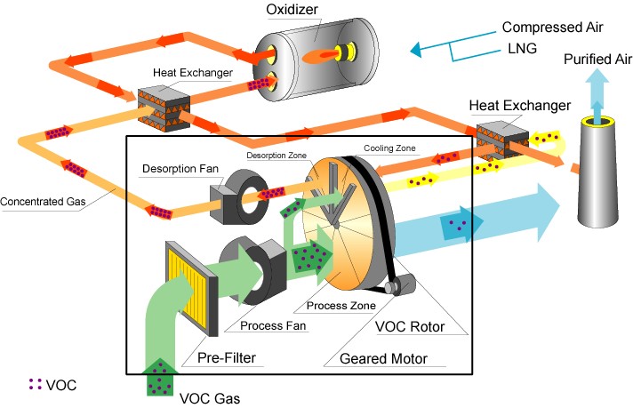 沸石作為一種天然的硅鋁酸鹽成分,其材料表面有很多孔隙結構,對voc具有吸附作用,將精致篩選后的沸石材料通過特殊工藝涂覆在蜂窩基材表面后,形成了可以用于廢氣吸附過濾凈化的特殊型材,具有很好的疏水性和不燃性,做成轉輪設備后可以連續處理車間排放的有機廢氣,吸附脫附或者還有冷卻同時連續進行,當轉輪進入脫附區域后,一定溫度的熱空氣對沸石材料進行脫附,脫附后的混合氣做氧化燃燒處理